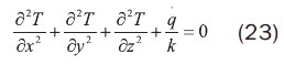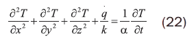 Siendo q el calor generado por el elemento diferencial, k la conductividad térmica, α la difusividad térmica (k/ρCp), ρ la densidad y Cp el calor específico del sólido.
