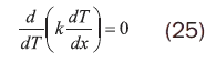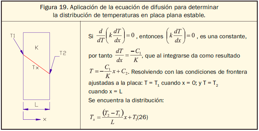 Ecuación que al resolverse para la geometría sencilla de placa plana, considerando la conductividad térmica constante y las condiciones de borde adecuadas, entrega la distribución lineal de temperaturas como se ve en la figura 19: