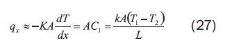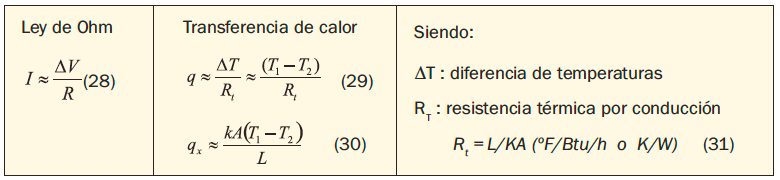 Resultado que se puede asociar con la ley de Ohm de circuitos eléctricos, porque el flujo de corriente es proporcional a un diferencial de voltaje e inversamente proporcional a una resistencia eléctrica, en tanto que la transferencia de calor es proporcional a una diferencia de temperatura pero con algún tipo de oposición que constituye la resistencia térmica, por lo cual: