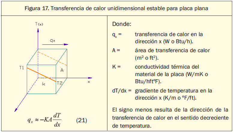 El modelo matemático que cuantifica la transferencia de calor por conducción es la ley de Fourier, que para una placa plana unidimensional se presenta en la figura 17.
