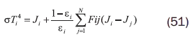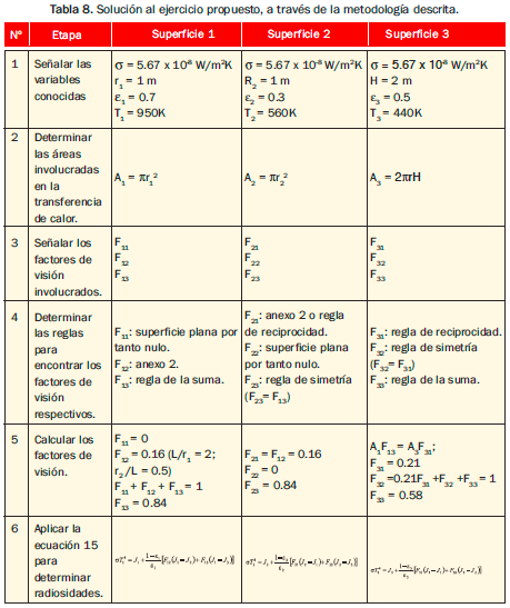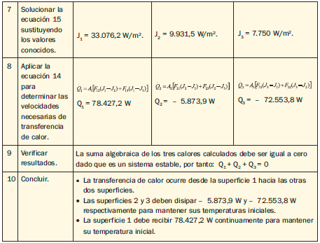 A partir de las ecuaciones 50 y 51 se obtienen N ecuaciones para determinar N radiosidades al interior de un recinto con N superficies. Conocidas las radiosidades, se pueden determinar las velocidades de transferencia de calor con la ecuación 50, y las temperaturas desconocidas con la ecuación 51. Si se presentan superficies aisladas (reirradiantes) las temperaturas se calculan a partir de la relación σTi 4 = Ji. Si el valor de Qi es negativo, significará que la superficie está recibiendo la radiación.