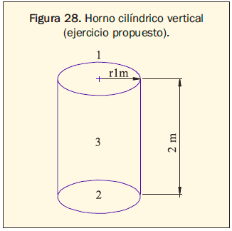 Ejemplo: Considere un horno cilíndrico vertical con condiciones de operación estacionarias, de radio 1m y altura 2m, como se muestra en la figura 28.