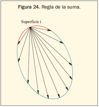 2. De la suma. La suma de los factores de visión desde la superficie i de un recinto cerrado hacia todas las superficies del propio recinto hasta, incluso hacia sí misma es igual a 1 (figura 24).