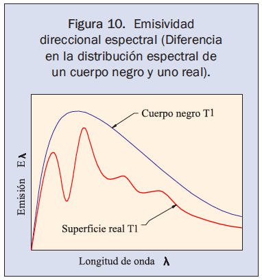 Relación entre la emisividad de una superficie a una temperatura dada a una longitud de onda específica, en una dirección específica, y la radiación emitida por un cuerpo negro a la misma temperatura, como se presenta en la figura 10.