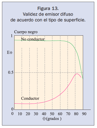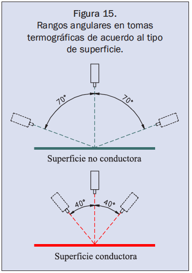 En la figura 13, θ = 0 corresponde a la emisividad en la dirección normal a la superficie. Se observa que la emisividad en un material conductor eléctrico permanece constante para valores de θ menores a 40º y en no conductores para valores de θ menores a 70º. Lo que significa que el valor de la emisividad de un cuerpo en su dirección normal es un valor significativo y que a nivel termográfico cuando la cámara se calibra en función de la emisividad hemisférica total (promedio) en la dirección normal del material, se puede realizar una desviación en la toma termográfica de hasta 40º ó hasta 70º con respecto a la normal según el material (figura 15).