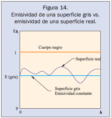 Dos consideraciones adicionales que se realizan para reducir la complejidad de la radiación corresponden con las aproximaciones de cuerpo difuso (figura 6, sección 1.2.4 y figura 13) y cuerpo gris (figura 14). El cuerpo difuso es aquel en que sus propiedades no dependen de la dirección y el cuerpo gris es aquel en que sus propiedades no dependen de la longitud de onda (figura 14).