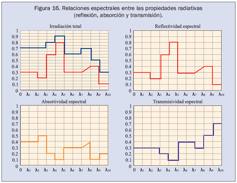 La figura 16 presenta la relación espectral que existe entre cada propiedad para un cuerpo particular. Nótese que la suma de las propiedades corresponde a la irradiación total y que dichas propiedades son de naturaleza espectral, así por ejemplo en el intervalo entre 0 y λ2 hay reflexión del 30%,absorción del 40% y transmisión del 30% de la irradiación total recibida.