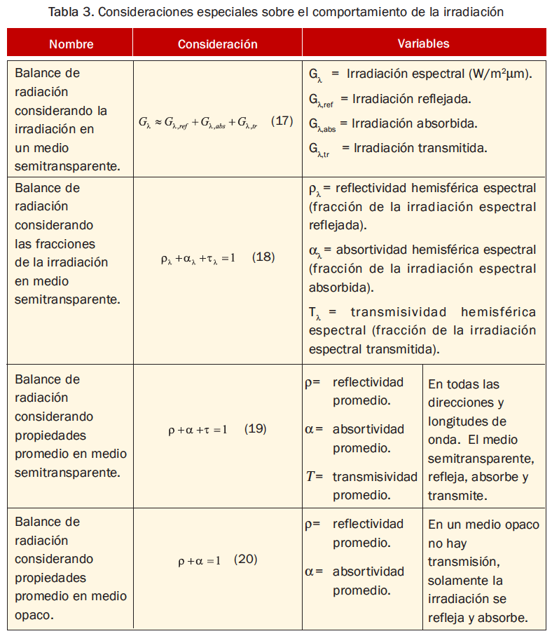 Tal energía, aplicando la teoría ondulatoria, se absorbe, refleja y transmite de tal forma que sus fracciones sean equivalentes a la irradiación total o a uno en términos absolutos. Como se describen en función de la irradiación son propiedades definidas en todas las direcciones, sobre el espacio hemisférico en todas las longitudes de onda (valores promedio). En la tabla 3 se encuentran las consideraciones especiales al respecto.